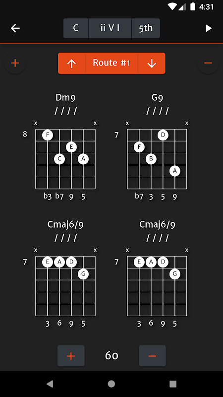 アプリケーションはプログレッションを再生でき、メトロノームとともに選択したバリエーションです。メトロノームの速度を設定し、演奏中のコード/図が強調表示されているのを確認できます。