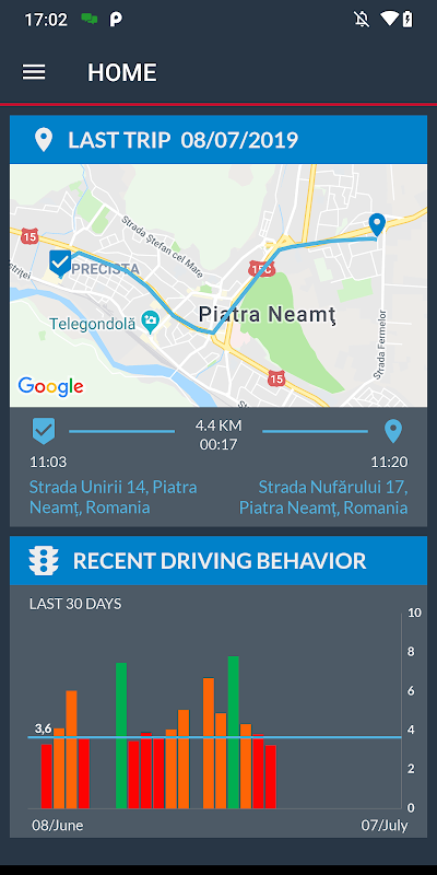 ドライバーアプリは、行った各旅行を表示し、運転行動を記録します。