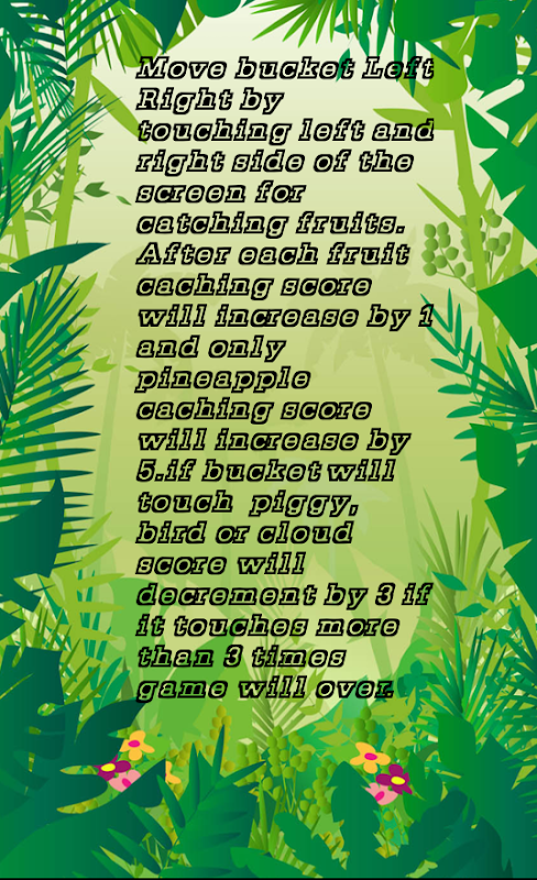 - Collect fruits by Moving bucket Left and Right by touching left and right side of the screen .