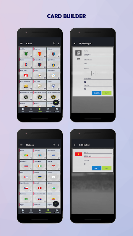 カードジェネレーターの使い方と操作はとても簡単です。数秒でカードを作成でき、すべてが見やすいダッシュボードに表示されます。カード、チーム、クラブ、バッジ、国家はいつでもプレビューできます。