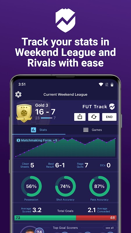 FUTチャンピオンズウィークエンドリーグとライバルの統計を追跡し、ゲームを分析して改善し、プレーヤーに関するデータ主導の意思決定を行います。