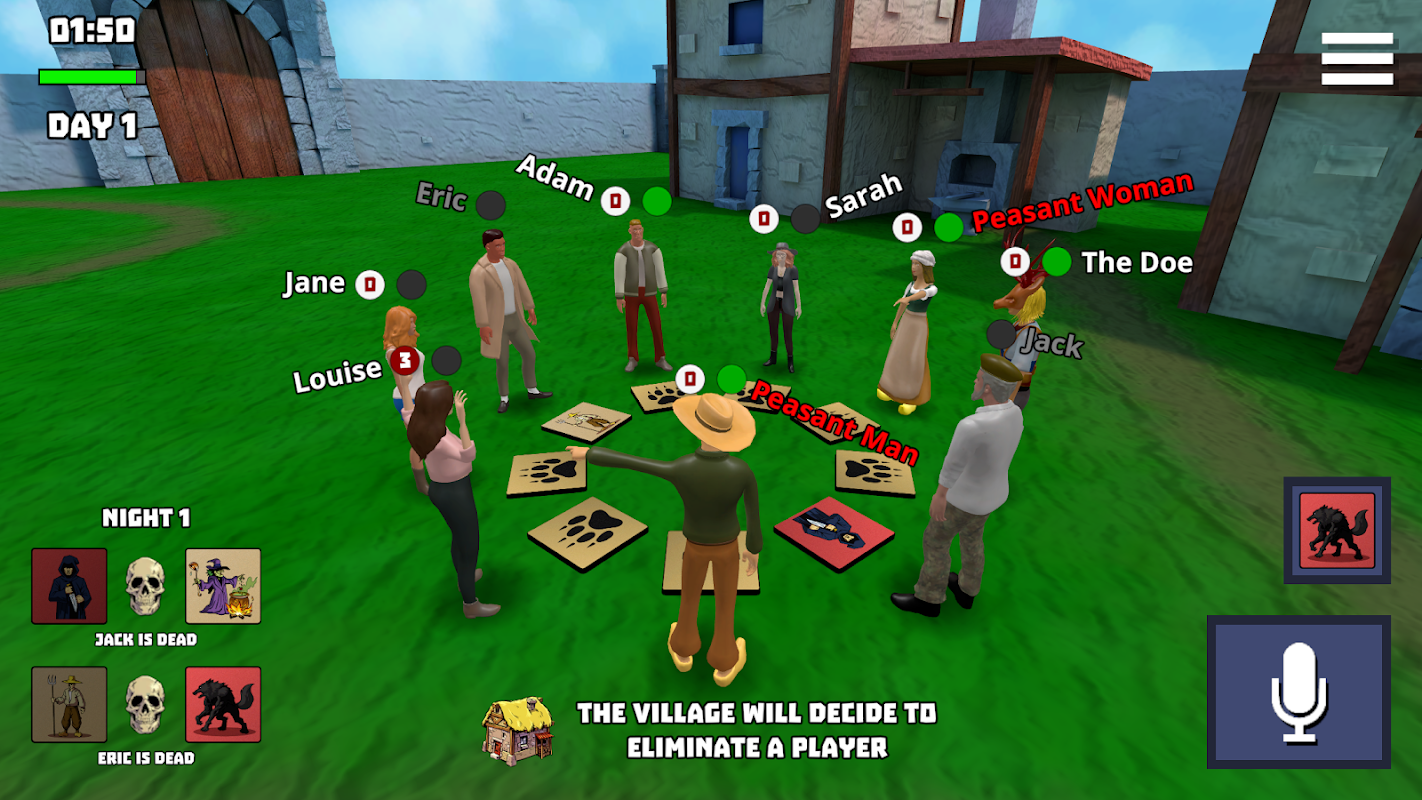 自分の役割を明らかにすることなく、戦略と与えられた権限を使用して、成功して勝つために自分自身またはチーム/パックのためにできる限りのことをしなければなりません。そうしないと、狼男に食い荒らされるか、日の出の投票システムを使用して村から排除されるか、または他の運命に直面することになります...