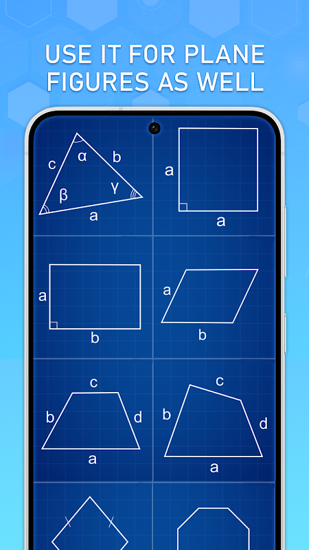 角度を測定し、対角線の式を計算し、半径を計算します。 目的の形状の周長と面積を簡単に計算します。 アプリケーションでは、パラメータを高速に計算するために次の形状を使用できます。