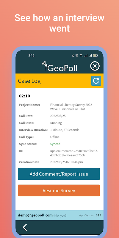 GeoPoll Interviewerアプリケーションは、GeoPollプラットフォームと連携して、列挙者がCATI(コンピューター支援電話インタビュー)および対面/ CAPI(コンピューター支援個人インタビュー)調査を実施するのを支援します。