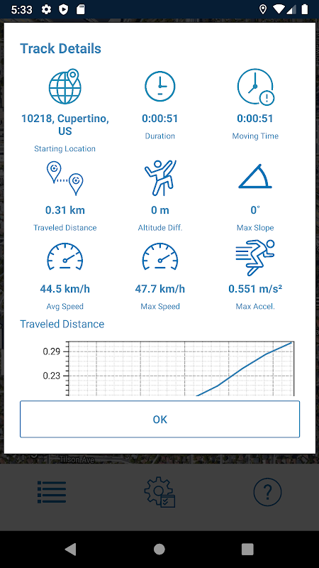 - 記録されたトラックの詳細を表示: 移動距離、移動時間、平均/最大速度、最大加速度、最大値など