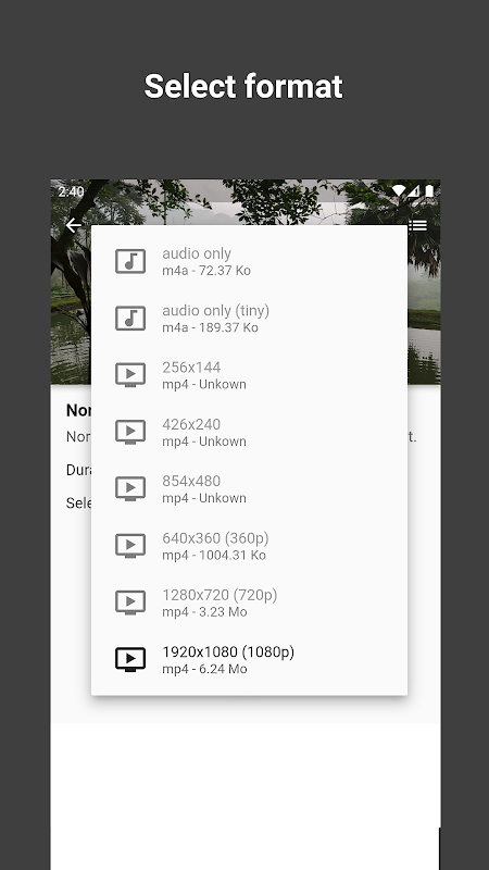 アプリまたはブラウザーの共有ボタンを使用し、[VDOを取得]を選択してビデオのダウンロードにアクセスします。その後、品質とファイルサイズの間の適切な妥協点を見つけるために、ビデオ形式を選択できるようになります。