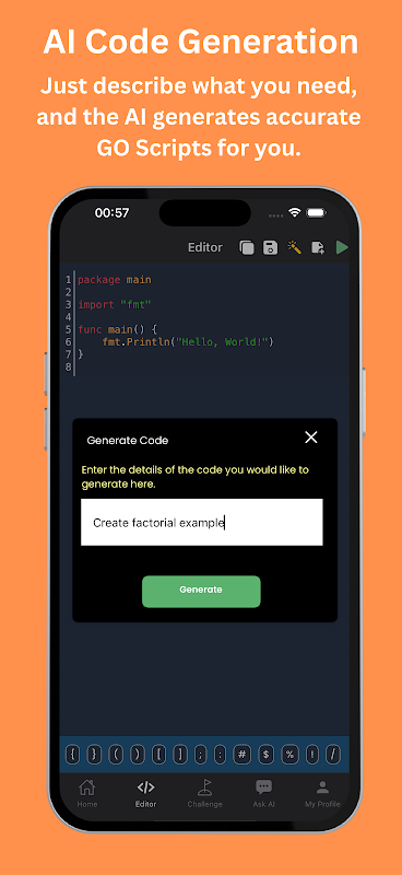 オールインワン プラットフォーム: コードの作成、実行、テスト、保存をすべてアプリ内で行います。 Go Editor と Go Compiler がシームレスに統合されているため、追加のツールやセットアップは必要ありません。