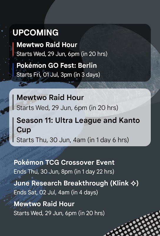 Go イベント ウィジェットには、進行中のイベントと今後のイベントのリストが表示されるので、レイド アワーやコミュニティ デイを見逃すことはありません。