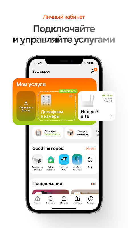 Goodline Cityは、ケメロヴォ州クズバスの住民向けサービスと個人アカウントの機能を統合したGoodline個人アカウントアプリケーションの進化版です。このアプリケーションでは、住宅・公共サービスとGoodlineの料金の支払い、交通カメラの閲覧、ニュースの閲覧、サポートへの連絡、接続サービスの管理が可能です。