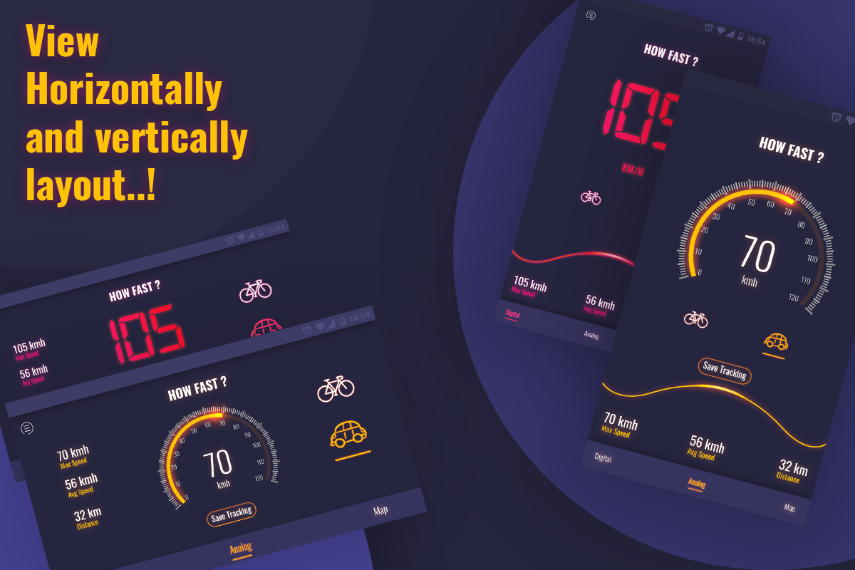 Speedometer is a free GPS digital and analog speedometer that shows your vehicle speed during cycling , driving , running, flying , sailing etc.GPS Speedometer support three different velocity unit (km/h, mph and knots ).