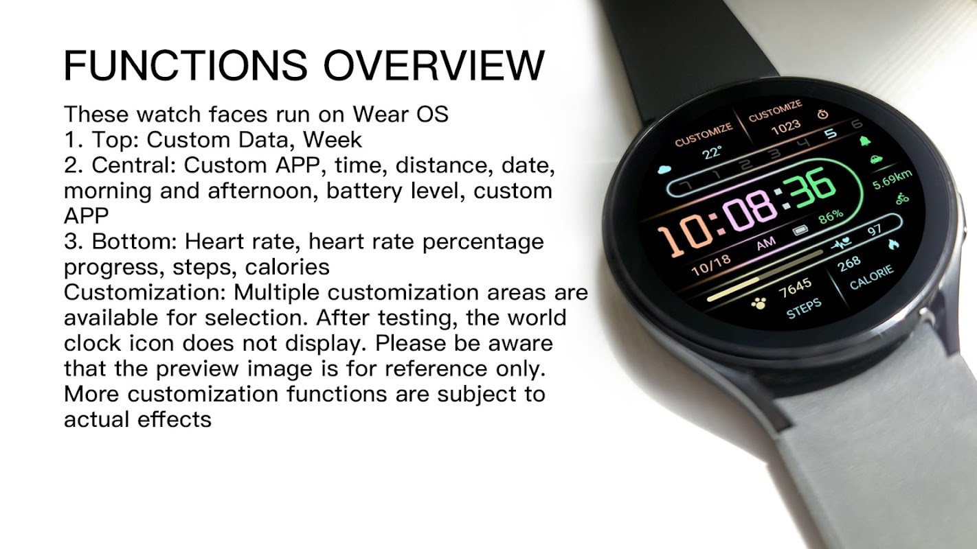 2. 中央: カスタム APP、時間、距離、日付、午前と午後、バッテリー レベル、カスタム APP