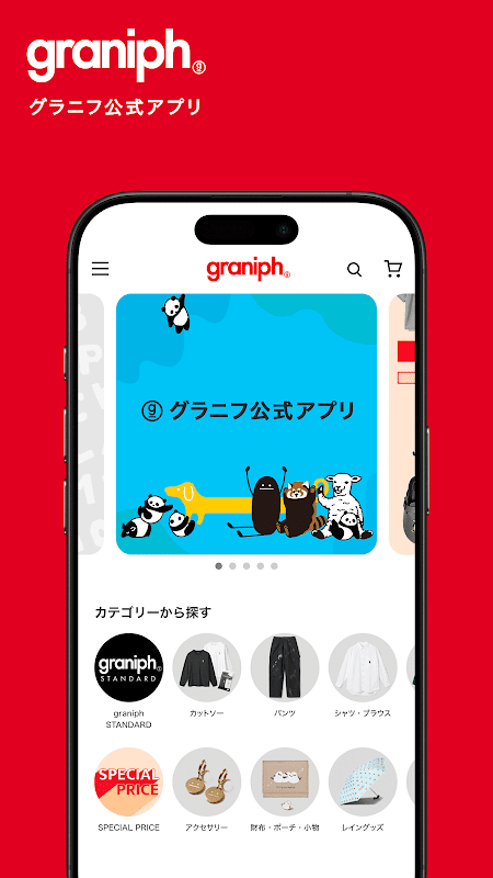 グラニフ公式アプリでは毎週リリースされる新着グラフィックアイテムや最新ニュースを外出先や電車の中などいつでもどこでもチェックできます。様々なグラフィックアイテムの中からぜひお気に入りを探してみてください。