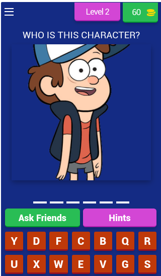 GRAVITY FALLSのお気に入りのキャラクターが、キャラクタークイズのエキサイティングなゲームですでにあなたを待っています!私たちのキャラクタークイズゲームでは、あなただけが知っている最も人気のあるキャラクターを紹介します。オフラインのキャラクターゲームで必要なのは、表示された文字からキャラクターの名前を正しく綴ることだけです。正解ごとにコインを受け取ります。後で、ゲームキャラクタークイズの質問の答えがわからない場合やわからない場合は、ヒントを購入するのに役立ちます。アニメを注意深く見れば、キャラクターゲームを推測するのは難しくありません。