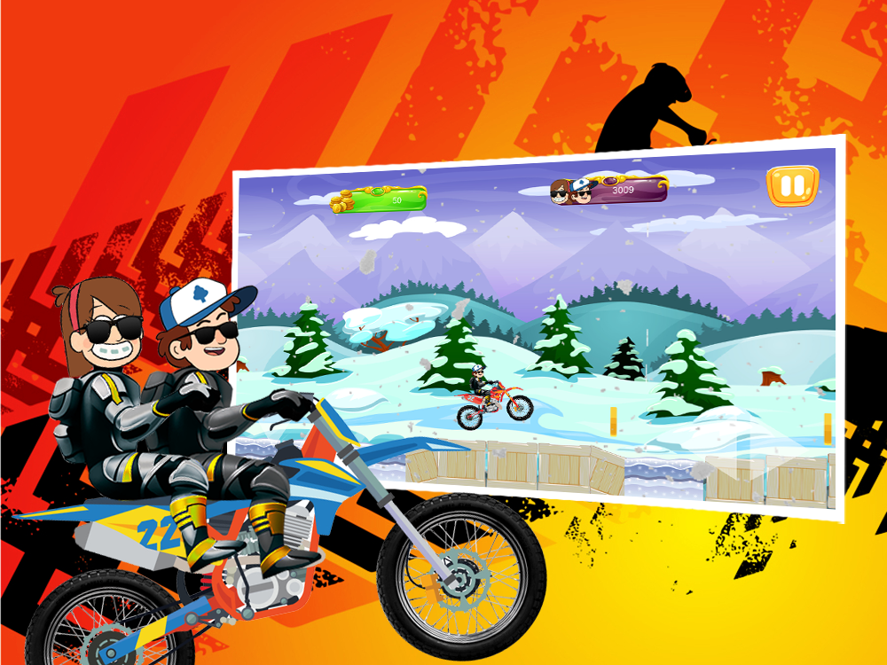 the famous hero of gravity fall Dipper and his twin sister Mabel, smart cartoon caracters,they were sent by their parents to gravity fall in Oregon,and they take adventures with motorcycle and unlock levels and motorcycles,