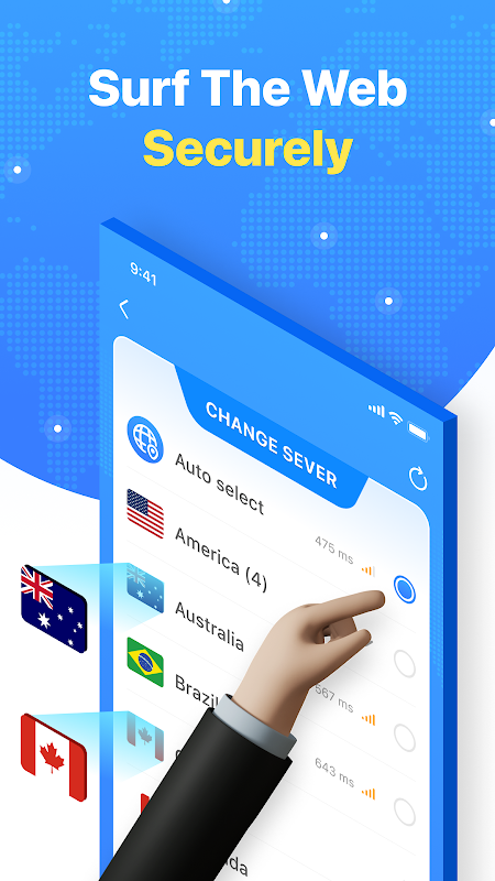 自動接続サービスにより、高速で無制限の接続が利用できます。これは、自動的にあなたの場所を検出し、最速のサーバーに接続します。ワンタップするだけで、地球上のどこにいても、超高速の VPN サービスを利用したり、当社のサーバーからコンテンツをダウンロードまたはストリーミングしたりできます。ワンクリック接続で使いやすく、最も近くて最速のサーバーを自動的に選択します。高速 VPN プロキシを楽しむために、登録、ダウンロード、または接続する必要はありません。