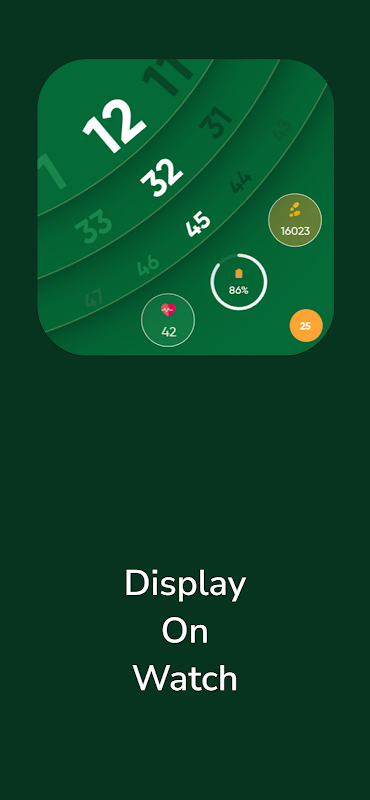 この Wear OS ウォッチフェイスは、深いグリーンのキャンバスを背景にしたミニマルな円形デザインで魅了され、シンプルさと現代的なスタイルの融合を体現しています。