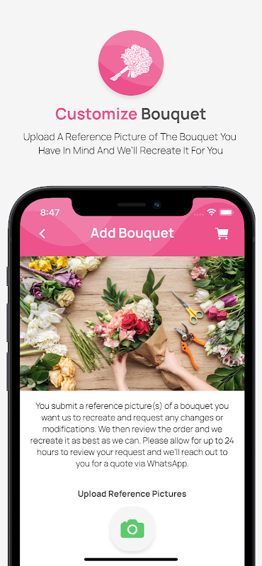 気に入ったリファレンスブーケの写真をアップロードしてカスタムブーケをリクエストし、その他の変更をリクエストすると、ブーケが作成されます。