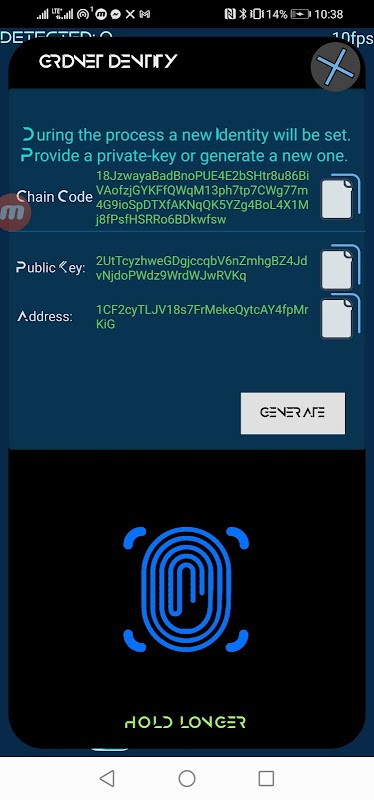 1)まず、新しい秘密鍵と公開鍵のペアを生成してウォレットを設定します。1回タップするだけで、仮想指紋センサーを数秒間押し続けて確認できます。