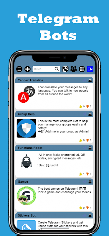Register your Group, Channel, Bot, Sticker in our Application can help you to promote your content to thousands of different users per day.