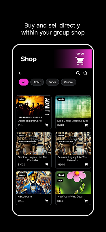 ショップ – 商品の販売、募金、イベント チケットの提供、すべての重要なグループの支払いと追跡を行います。