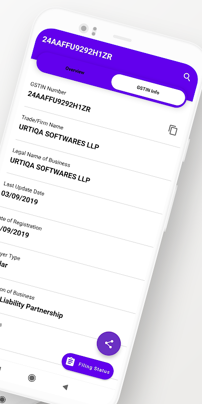 ビジネス情報 - ビジネスの詳細、GST の詳細、およびビジネスの GST 申告ステータスを、Whatsapp または電子メールを介してワンクリックで誰とでも簡単に共有できます。