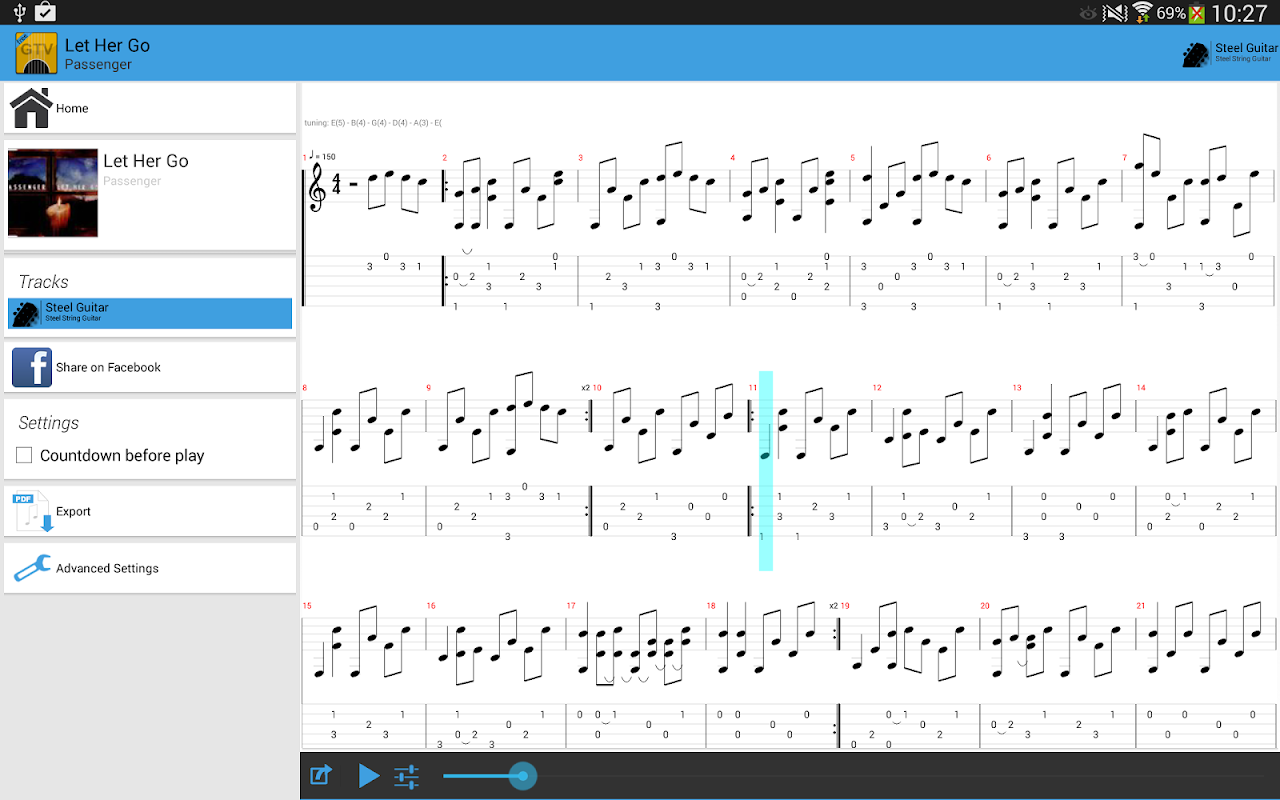 This application allow you to open and play Guitar pro tab files (Guitar pro 1 (gtp), Guitar pro 3 (gp3), Guitar pro 4 (gp4), Guitar pro 5 (gp5) and Guitar pro 6 (gpx)) or PowerTab tab files (ptb) and use your tablet as a songbook!