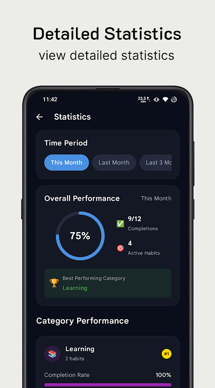詳細な分析:進捗状況、ストリーク、カレンダーの統計情報、完了率を表示。