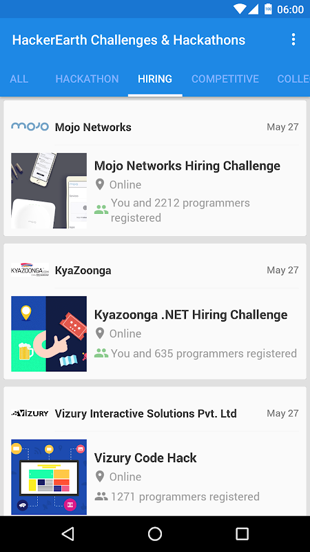 HackerEarth Challenges app helps you to register for the newest challenges and hackathons on HackerEarth on the move and be a part of the fastest growing developer community in the world. Learn, code, connect, compete with developers around the world and get hired by your dream company! What are you waiting for? Download the app and register today!