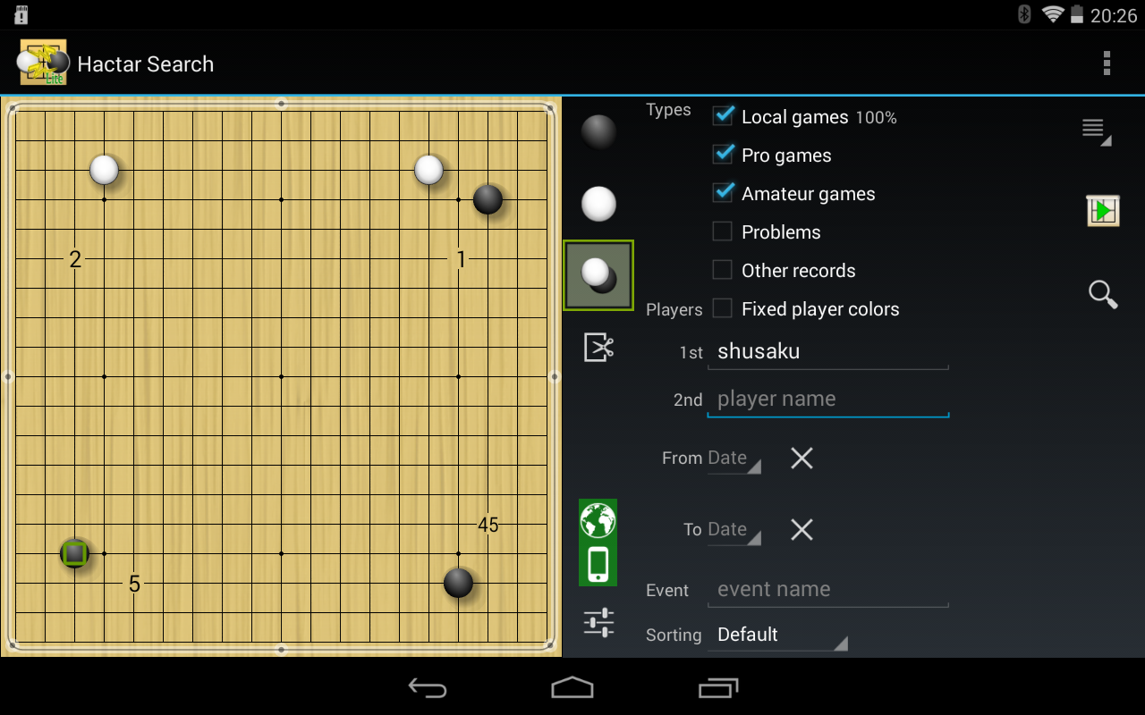石の位置や対局者名で棋譜を検索できます。著名な公開WEBアーカイブから80000のプロ棋譜を検索可能です。あなたの端末内の棋譜も検索できます。