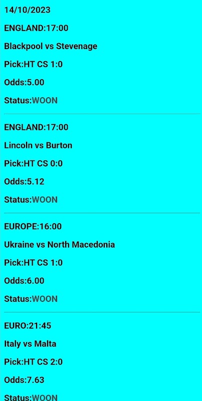 Here we only give halftime correct scores daily and they are very sure. Always max bet on singles as advised on the app title