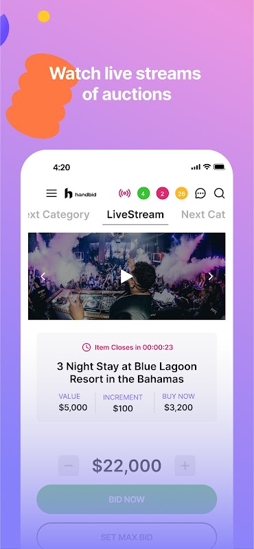 Handbidは何百ものイベントに力を与え、その過程で何千もの入札者を喜ばせてきました。 iPhoneとAndroidのネイティブアプリ、およびスマートフォン以外のユーザーがiPadで利用できるキオスクアプリを使用すると、サイレントオークションを実行するための優れたエクスペリエンスとソリューションはありません。
