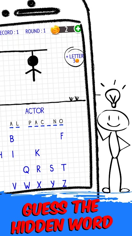 隠された単語を推測するのに役立つ文字を選択します。正しく推測した文字は、その文字の配置されたアンダースコアの上に表示されます。正しく推測した文字の数が多いほど、単語を正しく推測できる可能性が高くなります。間違った文字を選択するたびに絞首台が形成され、その後に棒人間の姿が現れます。棒人間の姿が完全に完成するとゲームオーバーです。