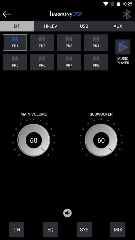 メイン画面には、BT、HI-LEV、USB、AUXを選択できる入力ソースメニューがあります。ここには、8つのプリセット(デバイスに保存されている)から選択することもできます。ミュージックプレーヤーにアクセスし、メインとサブウーファーのボリューム、およびチャンネル、EQ、システム、ミキシングを備えた詳細メニューがあります。