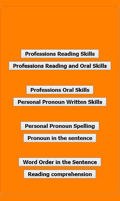 Proceed to read vocalized text with the same professions. Learn to read and spell the different professions. Test yourself. Proceed to learn personal pronouns the same way. Proceed to simple nominal phrase with professions, learn the word order in nominal sentence, how to use a short phrase with personal pronouns, learn how the pronouns are spelled, pronounced and used.