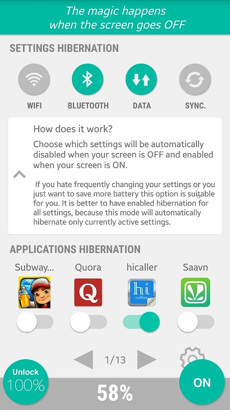 Choose which battery-draining apps will be disabled (hibernated) when the screen is OFF.