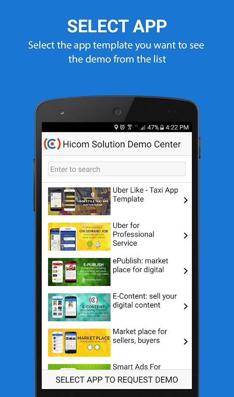 HiCom Solutions Demo Center is the center for you to request demo information of all app template source codes that HiCom provides.