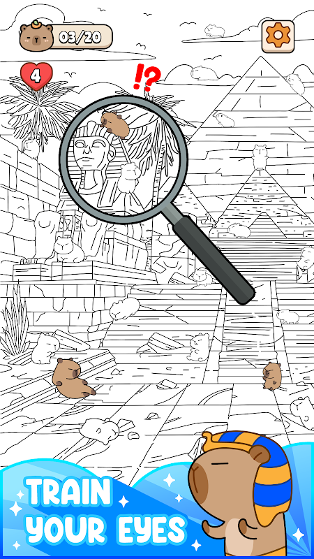 挑戦的な白黒シーンやカラフルなシーンに登場した愛らしいカピバラたちを見つけよう。ズームインして探検し、あらゆる年齢層が楽しめる、楽しくて夢中になれるゲームで、観察力を鍛えましょう!