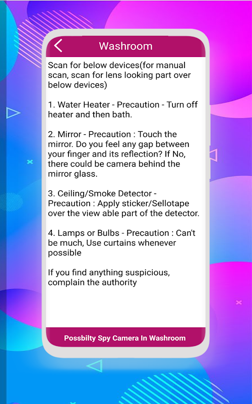 Spy camera and spy devices are place in hotel. this hidden camera detection have special filter for finding hidden camera. for example mostly hidden devices are place the following area. like bathroom hidden camera bedroom spy camera and microphone move your mobile near every device and the secrets devices detector app will show possibility of hidden spy microphone and camera. so you use this app as infrared camera detector and night vision camera finder.