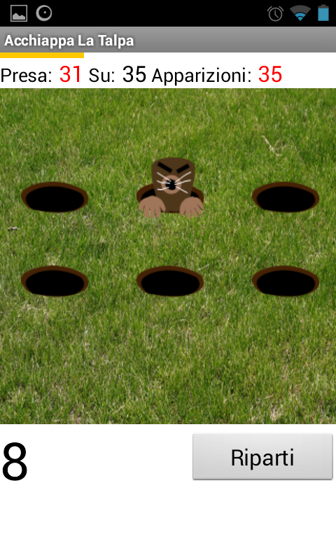 I livelli di difficoltà si basano sul tempo che hai a disposizione per prendere la talpa nel suo buco: easy 2 sec, medium 1 sec, hard 0,7 sec, extreme 0,5 sec.