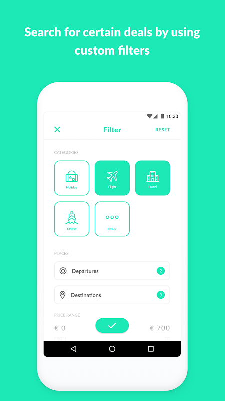 Find the trip of your dreams at the lowest possible price. Are you looking for a flight to the other side of the globe for 100€? Or are you looking for a low cost all-inclusive trip? In that case, Holideals is going to help you! We will notify you instantly, as soon as there is an error fare or any great deal available, which brings you to your desired destination. Holideals trawls multiple travel websites to find the best offers for you. Download Holideals now, so you won’t miss the chance to save a lot of money when booking your next journey!