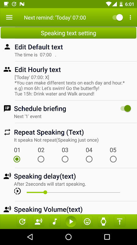 - アプリの電源をオンにするだけ自動的に毎日午前8時から午後10時まで定刻に通知音との時間を音声でお知らせします! (何も設定をしなくても言葉ヘッドであろう。心配しないで!全然難しくない!)