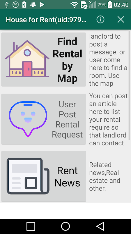 -GPS衛星測位を使用して、近くのレンタルハウスをすばやく見つけ、アイテムをレンタルし、電子メールで家主に連絡します。