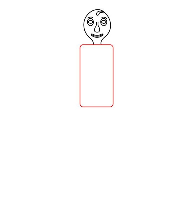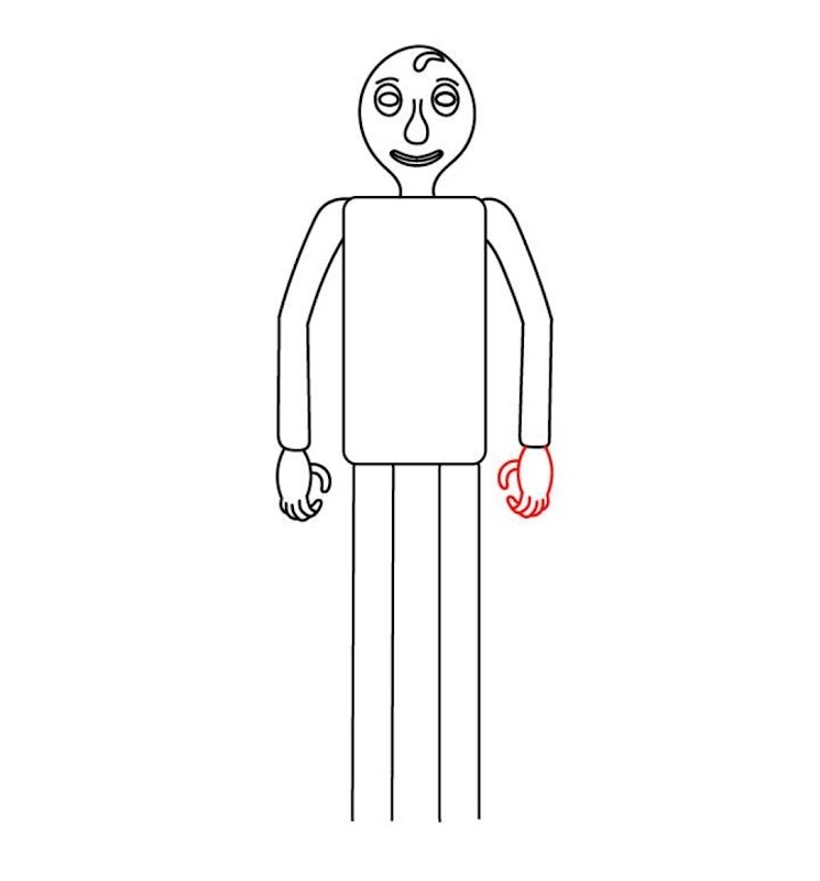 まず、1本の髪と薄い顔のバルディヘッドを描き、次に細い体、細い指の手、赤い唇を描く必要があります。 次に、バルディグリーンのジャケット、青いズボン、茶色の靴を描く必要があります。 バルディが定規を手に持って描くところはたくさんあります。