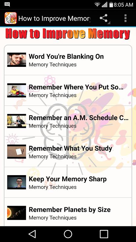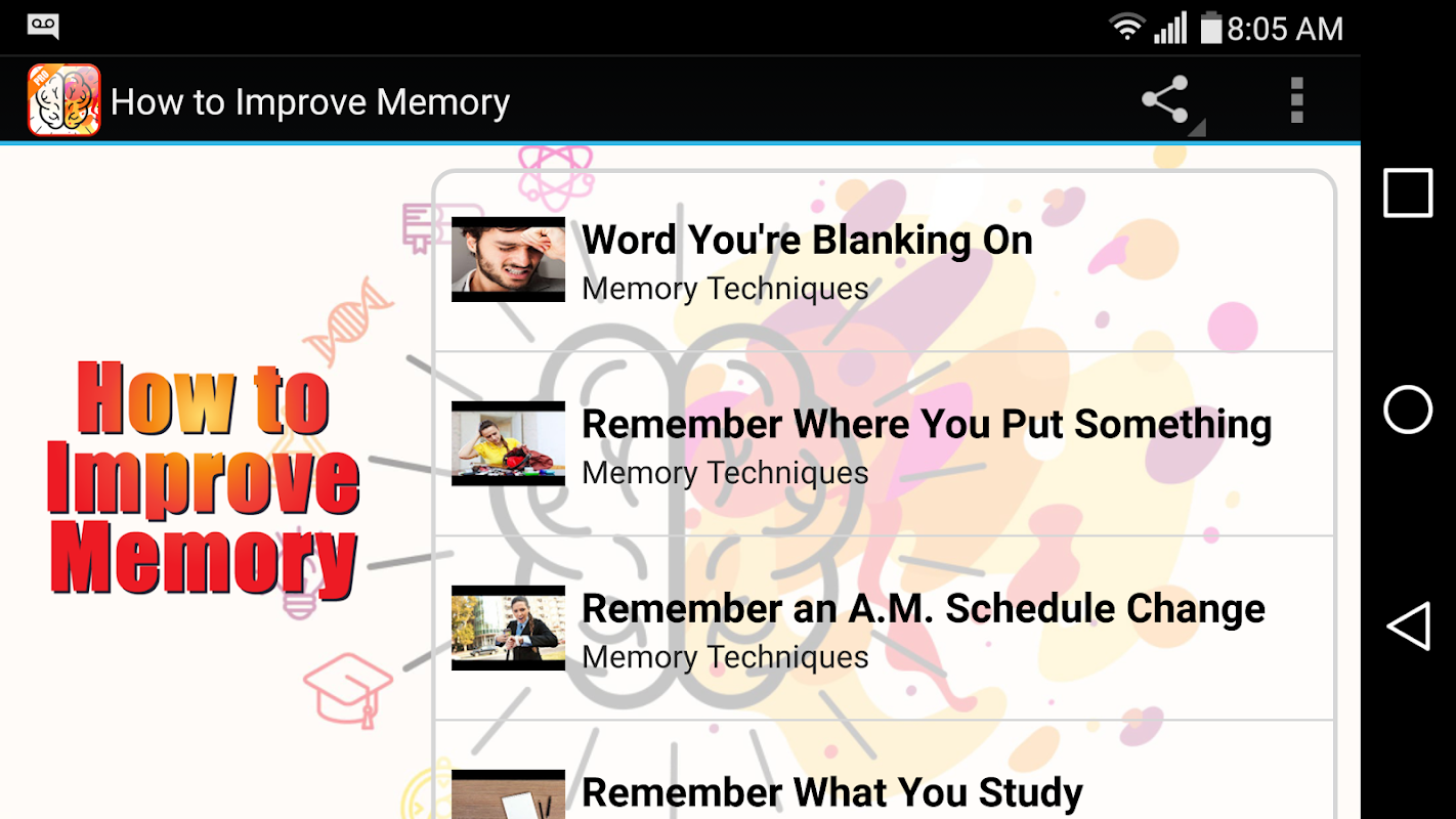 Download this app and learn how to improve your memory and stop forgetting things. You can always improve your memory and there are many different methods, tricks and tips for memory improvement and most of them are easy to follow.