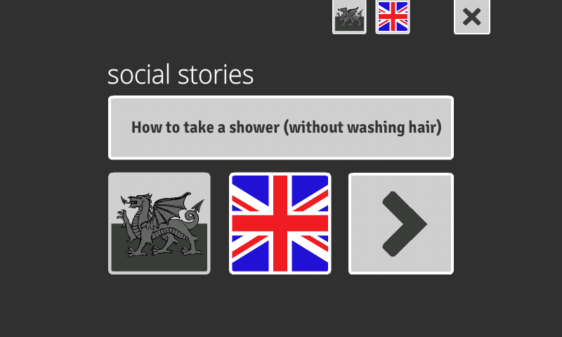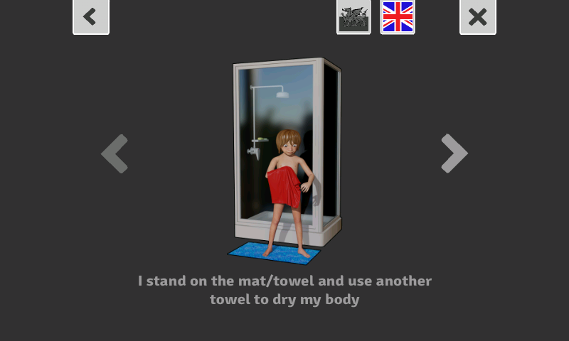 How to take a shower (without washing hair) is one of a series of bilingual lightweight apps designed to develop the social skills of children on the autistic spectrum, including Asperger’s Syndrome. This particular app shows children how to take a shower. It includes Welsh and English versions.