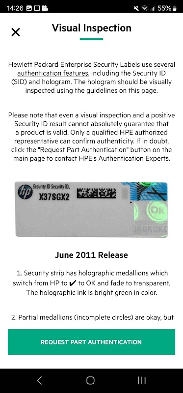 HPE Parts Validationモバイルアプリを使用すると、HPE純正部品を購入したことを示すHPEセキュリティIDを簡単に検証できます。アプリは、追加の目視検査をガイドしたり、HPEの認証エキスパートに直接連絡したりすることができます。HPEセキュリティラベルとHPE Parts Validationアプリの詳細については、www.hpe.com/products/validateをご覧ください。