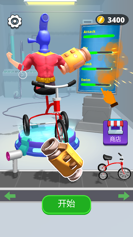 強力な効果を持つ必要なパーツを体に取り付けます。ドリル、シャワー、銃、バイク、プロペラ、ヘアドライヤー、その他の面白い小道具をゲームで試すことができます。適切なパーツを選択し、さまざまな障害物を越えて敵を倒し、最後まで到達してください。