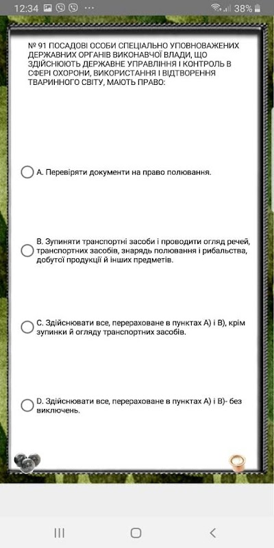このプログラムには、適切な新規参入者が本物のハンターになり、「ハンターの証明書」を取得するためのいくつかのテスト問題が含まれています。このアプリケーションは、ハンターの行動規則と安全性に関するハンターの実践的なトレーニング、条件付き信号、ハンターの法律とコードの取得を容易にします。