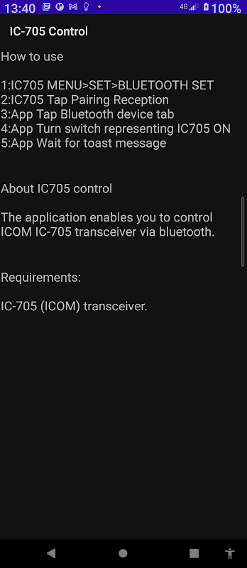 このアプリを使用すると、Bluetooth通信を介してIC-705(ICOM)を制御できます。