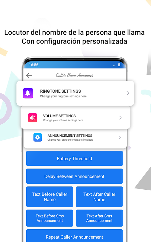 El altavoz del nombre de la persona que llama le ayudará a anunciar el nombre y la identificación de la persona que llama, cuando esté ocupado y no pueda tocar su móvil y no necesite mirar su teléfono móvil. Simplemente active la aplicación sms para anunciantes y manténgase ocupado con su trabajo. Cuando reciba una llamada entrante, la aplicación anunciará automáticamente el nombre de la persona que llama. Si recibe un SMS, la aplicación anunciará el nombre del remitente del SMS y leerá el contenido dentro del SMS. Identificador de llamadas con nombre y foto. Ahora no use un teléfono móvil cuando esté ocupado, simplemente active el nombre de la persona que llama Talker. detector de llamadas es una aplicación de estilo de llamada real que recibe llamadas entrantes mediante notificación de anuncio. Puede usar este anunciador del nombre de la persona que llama para cuál es la aplicación y en mi opinión, así que descargue el identificador del nombre de la persona que llama ahora y siéntase cómodo con esta aplicación de lectura del nombre de la persona que llama y el lector de sms. con detector de llamadas con nombre.